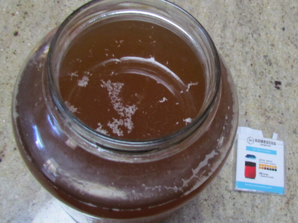 - After 4 days I’ll check the kombucha tasting it to see if it is slightly tart. Using pH strips I test the pH. It should be 3.5 or lower.