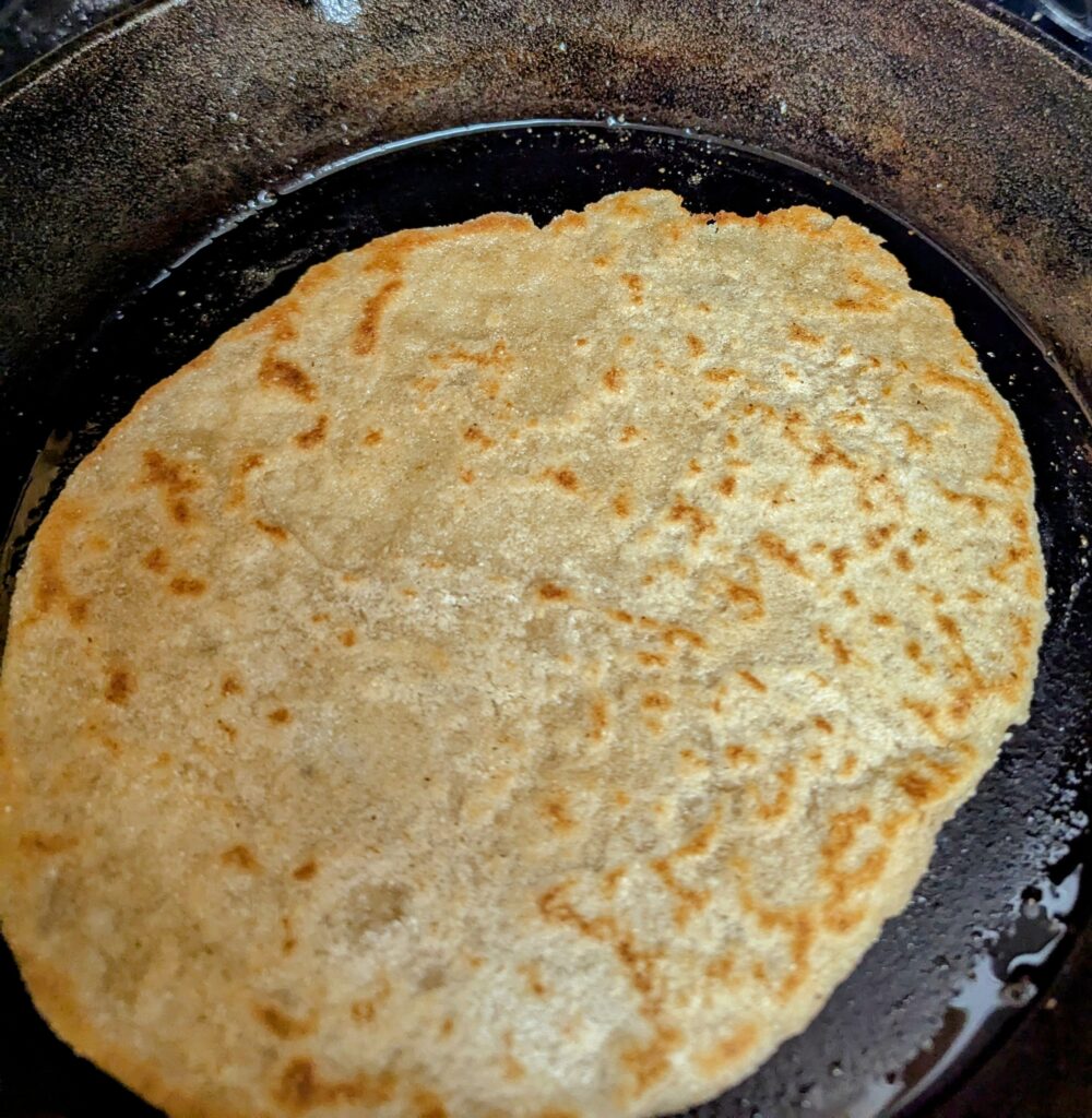 Mix all ingredients together in a large bowl with a spoon, your hands or with a Danish whisk which is what I use. I use cold water not warm water. Knead the dough with your hands for a few minutes until it forms a loose ball. No need for a stand mixer for this. If your using whole grains you’ll want to leave it much looser than you anticipate because the white whole wheat flour will absorb the water much slower than an all purpose flour will. Don’t use too much flour or it will be hard to roll out or press. Cover the bowl with a wet tea towel or some cling wrap and allow the dough to sit in a warm spot for 6-8 hours or overnight. If you need more time to get to it, put it in the fridge and pull it out 6-8 hours before your going to make it. The fridge time will slow the fermentation. My fridge makes my dough so cold I can’t work with it until it has sat out for at least 2 hours at room temperature, sometimes 6 depending how warm my kitchen is. This recipe will make about 12 6 inch tortillas if you want bigger whole-grain tortillas make only 6 or double the recipe. If your using a rolling pin roll the dough into a ball in your hand and place on a lightly floured surface and press it down. Flip the ball over to get a bit of flour on the bottom. Carefully roll from the center out to make it a circle. Make these as thin as you can without breaking. You’ll get better at it the more you do it. I use a tortilla press, I find it faster than rolling. I have this one https://amzn.to/4gj8Djf. I use gallon sized freezer bags placed over each side of the press. I did not find the wax paper circles included with the press very useful, the freezer bags keep the tortillas from sticking and I wash and reuse them. I cut a slit in the bottom of one bag to push the press handle through. The great thing with a tortilla press is I can quickly take a piece of dough, roll it in a ball and let the press do the work and get them quickly into my preheated cast iron skillet left over a medium to low heat. I use 2 to 3 cast irons skillets at a time. You’ll want your skillets hot enough to hear a sizzle when you throw a bit of water on the pan. Don’t get the pan so hot its burning immediately or so low that its taking a long time to become golden brown. It should only take a minute or so to see the flattened dough get a bit puffy in spots and be ready to flip. I have one burner that requires a completely different temperature setting than the other burner. You’ll have to play with it a bit.